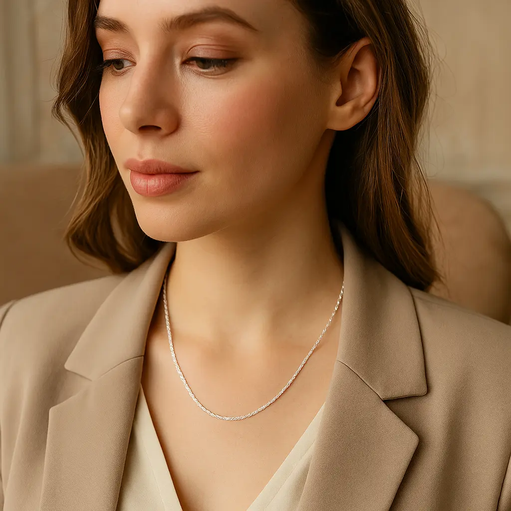 Cadena Singapur Plata 925 de 45 cm, diseño entrelazado que refleja la luz con cada movimiento. Elegante, delicada y perfecta para acompañar cualquier look.