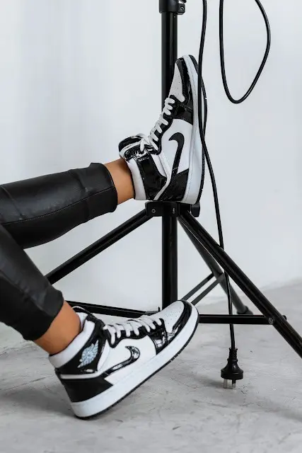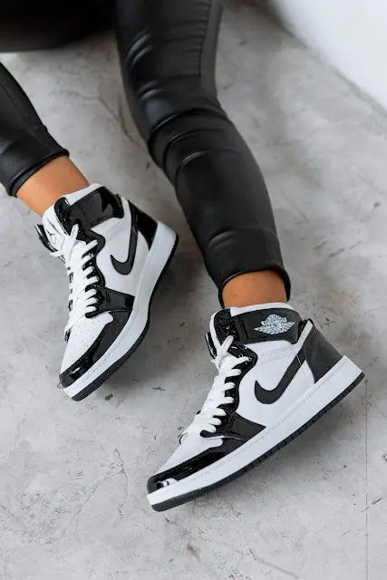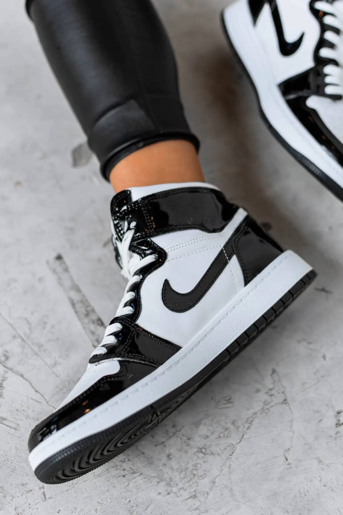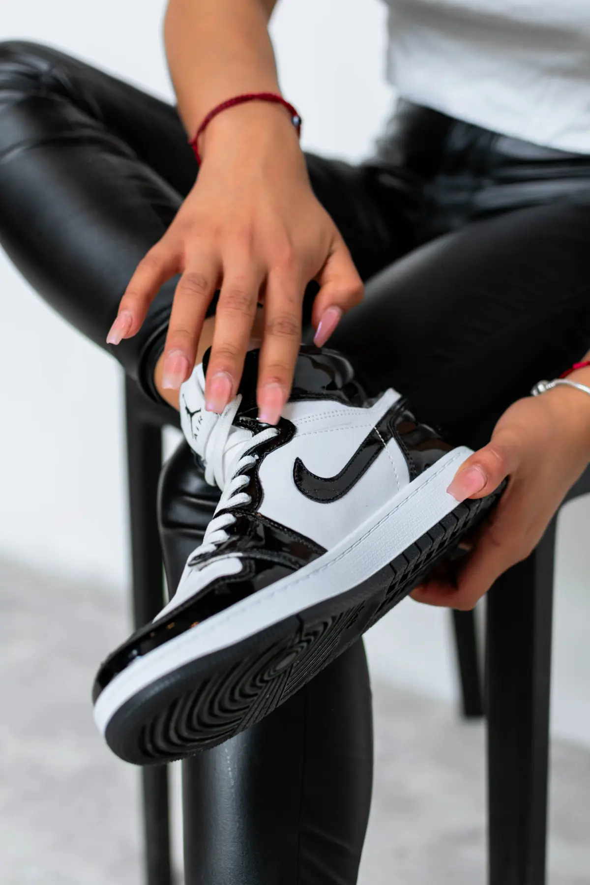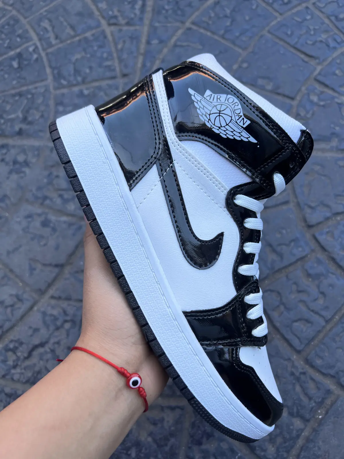 Caña media, contraste blanco y negro, terminaciones en charol y el inconfundible logo Wings en el tobillo. Un clásico del básquet que hoy domina la moda urbana.